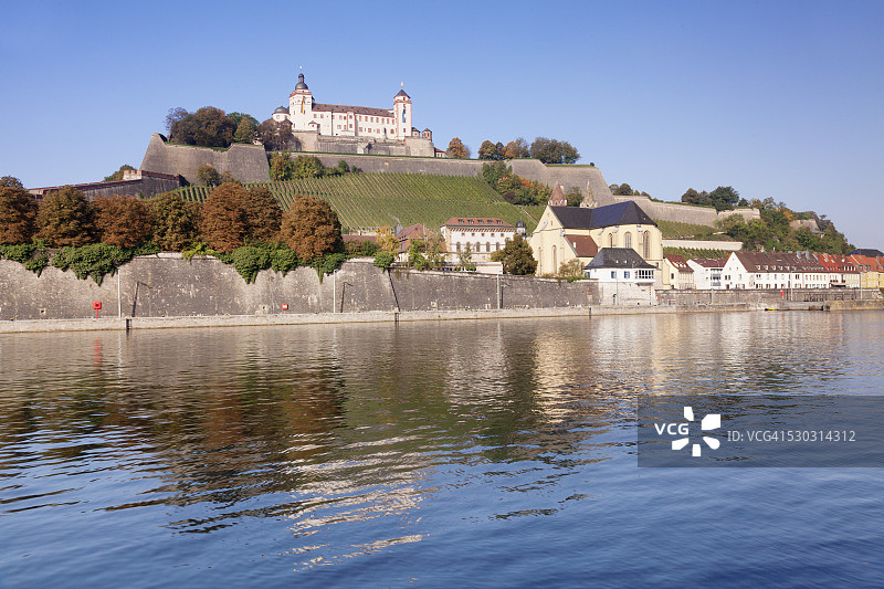 维尔茨堡美因河、玛丽恩堡要塞和圣布尔卡德教堂秋景图片素材