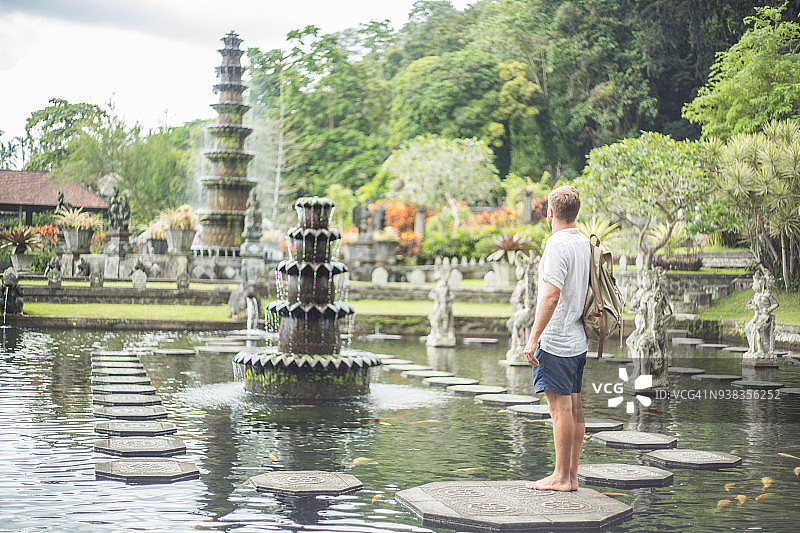 年轻男人在印度尼西亚巴厘岛TirtaGangga寺庙图片素材