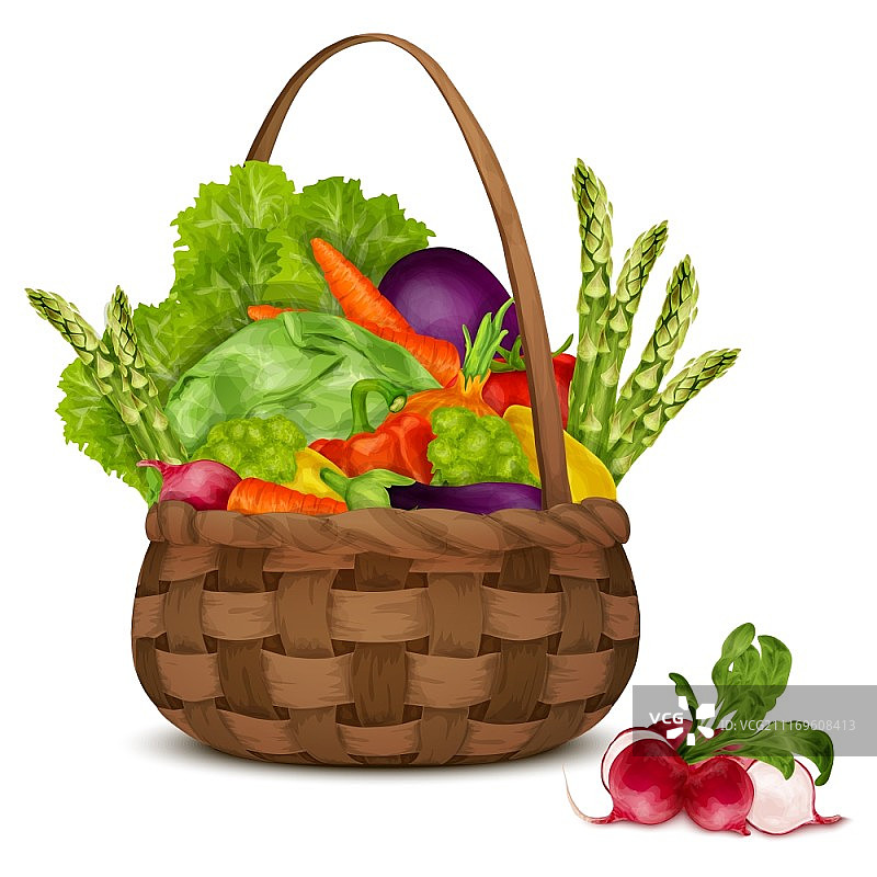 篮子里的新鲜有机蔬菜食品静物矢量图,白色背景分离图片素材作品是由视觉中国旗下网站(VCG.COM)的图片品牌合作方:Ingram Vectors提供,作品作者是:Ingram;图片ID:VCG211169608413;最大规格:EPS 矢量图形;存储大小:1.97 MB - EPS;授权方式是:;当前图片素材提供下载与正版授权服务,助力您的品牌提升。