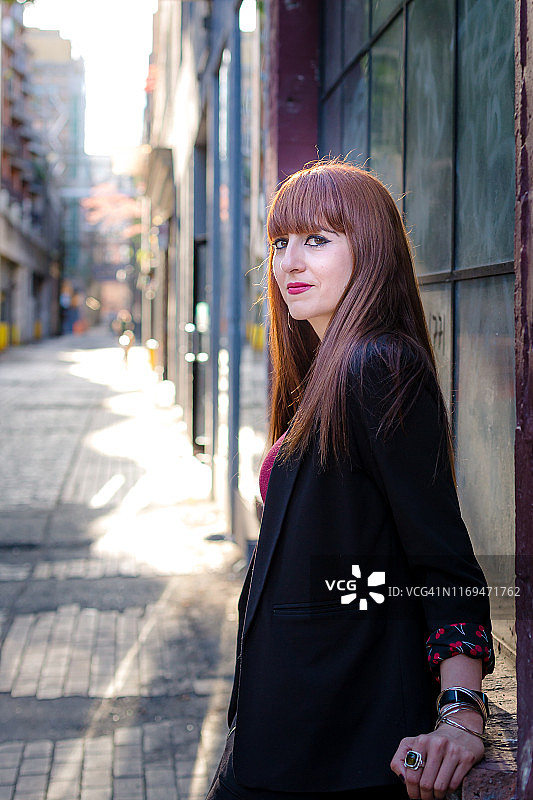 女人靠在城市小巷的窗户上图片素材