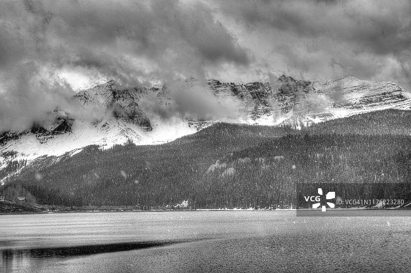 山区鳟鱼湖的暴风雪图片素材