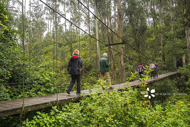 游客走过厄瓜多尔奥塔瓦洛附近,佩古切瀑布河流上的悬索桥图片素材