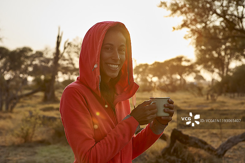 日出时分,女士在博茨瓦纳的奎河喝咖啡图片素材