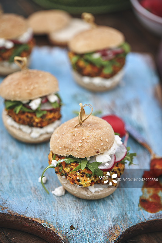准备藜麦蔬菜迷你汉堡,配茅屋奶酪和萝卜图片素材
