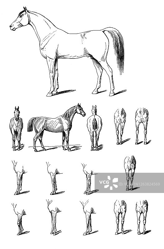 马匹外部结构古老雕刻插图:马科动物解剖学