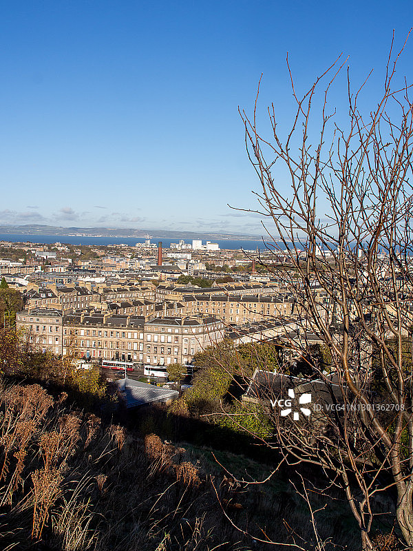 从爱丁堡卡尔顿山俯瞰利斯和福Forth河口的景色图片素材
