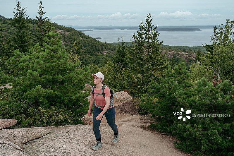 在阿卡迪亚国家公园徒步的孤独女人图片素材