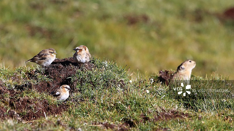 三江源国家公园的棕颈雪雀和鼠兔图片素材