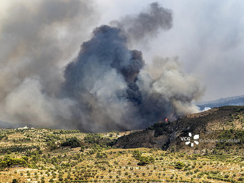 西班牙阿利坎特省小山镇周围的森林火灾火焰图片素材
