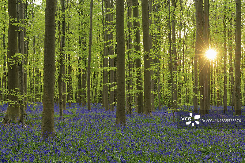 日出时山毛榉森林中盛开的蓝色风铃草图片素材