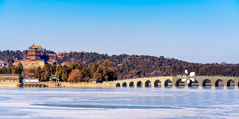 中国北京颐和园万寿山佛香阁和十七孔桥冬季风光