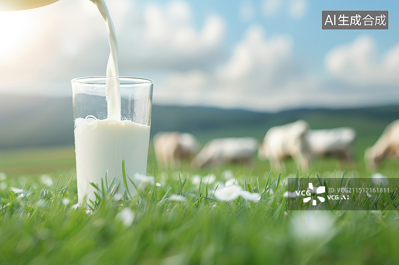 【AI数字艺术】牧场上新鲜的牛奶倒入玻璃杯图片素材