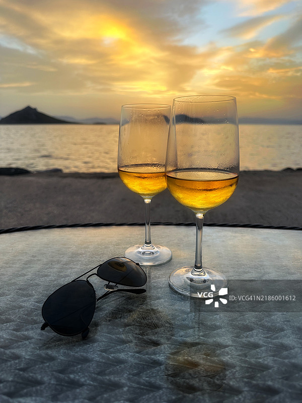 日落时分,希腊埃基纳岛桌子上的两杯白葡萄酒和一副太阳镜图片素材