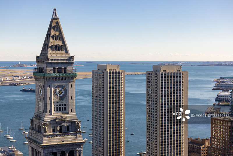 俯瞰波士顿海关大厦和波士顿洛根国际机场的景观图片素材