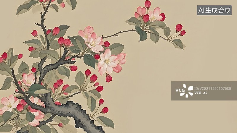 【AI数字艺术】水墨画海棠花等花卉装饰背景居左